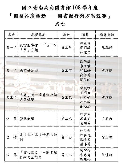 108學年度圖書館行銷方案競賽獲獎名次