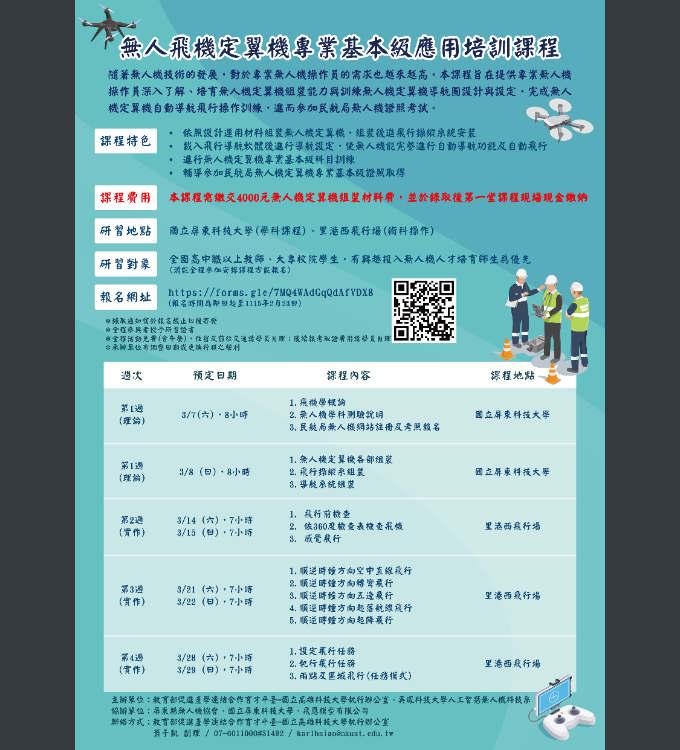 (二)課程地點:國立屏東科技大學(學科課程)、里港西飛行場(術科操作)。