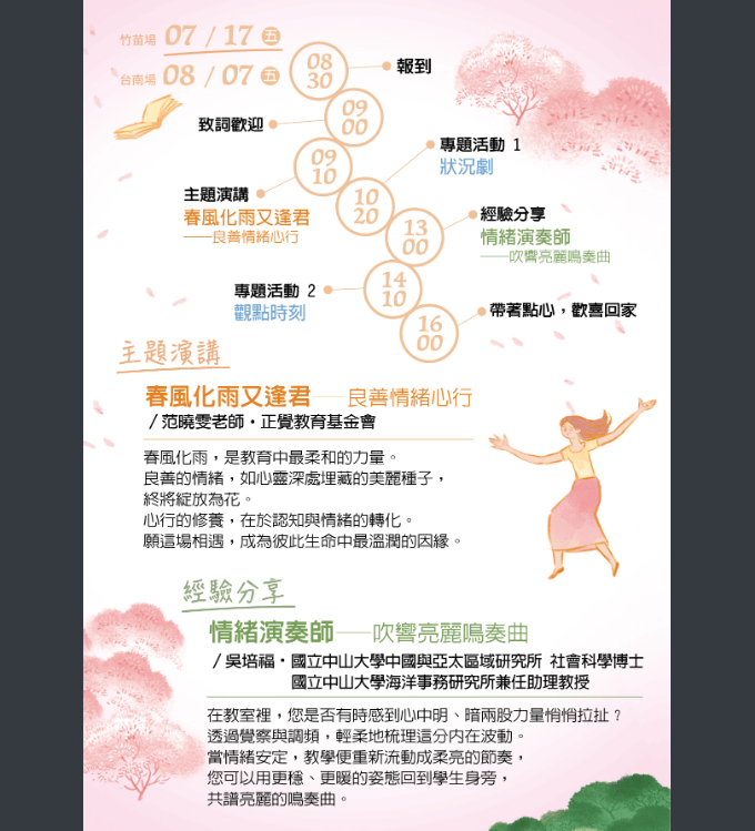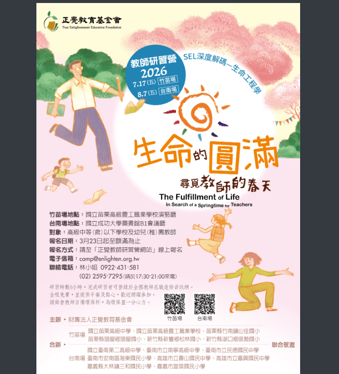 二、本基金會於2026年暑假期間舉辦竹苗、臺南兩場教師研習活動「生命的圓滿──尋覓教師的春天」如下: