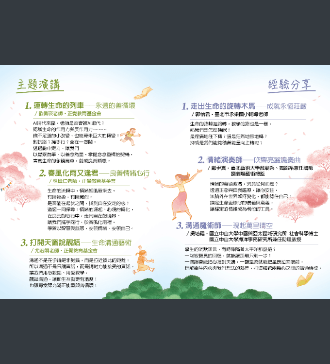 三、本基金會與臺北市立成淵高級中學、新北市立三民高級中學、桃園市立仁和國民中學、宜蘭縣立東光國民中學、新北市永和區秀朗國民小學、新北市新莊區光華國民小學、基隆市暖暖區碇內國民小學,共計7所學校合辦教師研習活動「生命的圓滿──尋覓教師的春天」,說明如下: